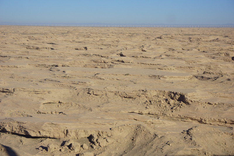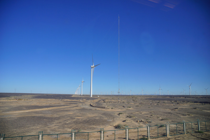 车窗外掠过成排高大的风车,叶片随风转动,在这里的茫茫大戈壁之上,显得格外壮美。真可以和荷兰的风车相媲美!