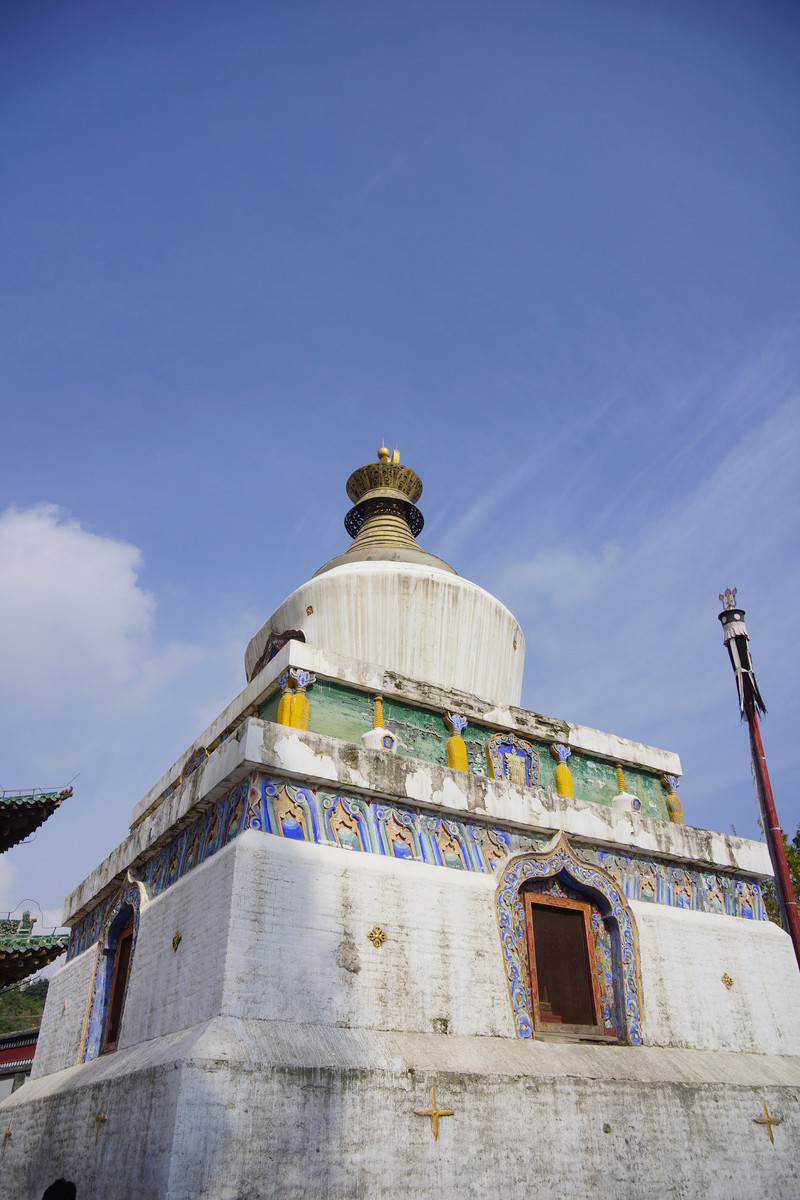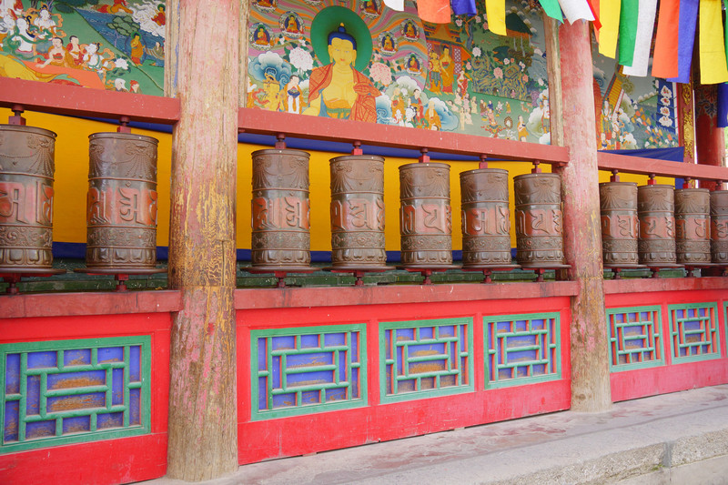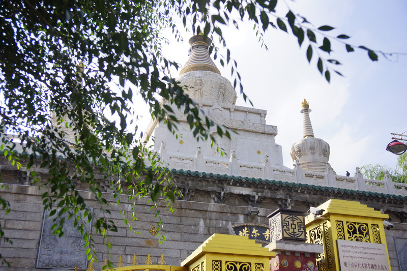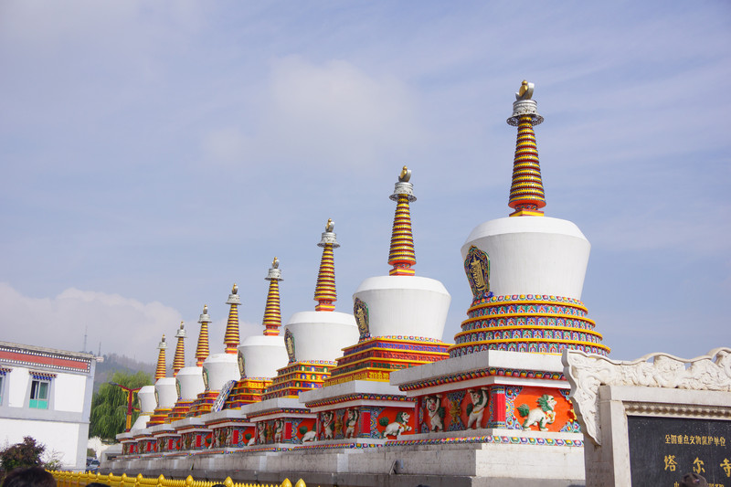 一进寺庙,可以看到广场上醒目的一字排开地排列了八个白塔,叫做八宝如意塔。每座宝塔均属于方形底座圆身,是典型的藏式塔。