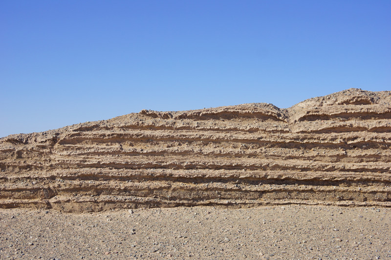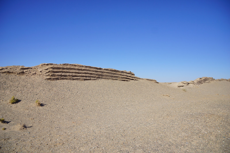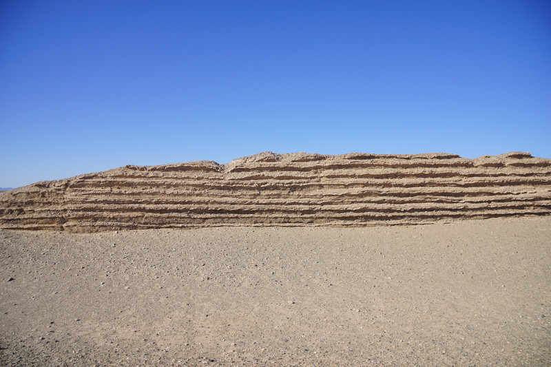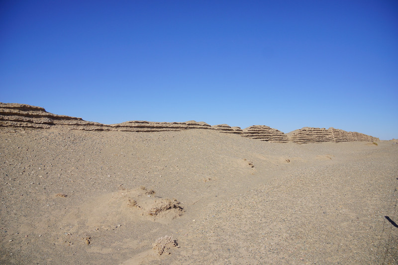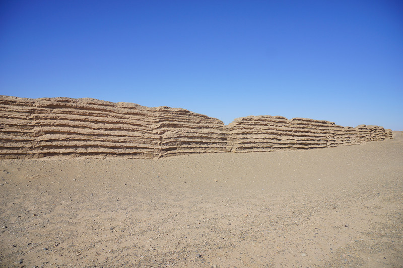 多半长城保存下来,这段汉长城远没有想象的雄伟,长城残高只有不到两米,下面近一半还被砂石掩埋了。因为在敦煌这一带全是流滩、石子,汉长城的建筑结构中并无砖石,是由砂石夹红柳或芦苇层叠夯筑的长城。