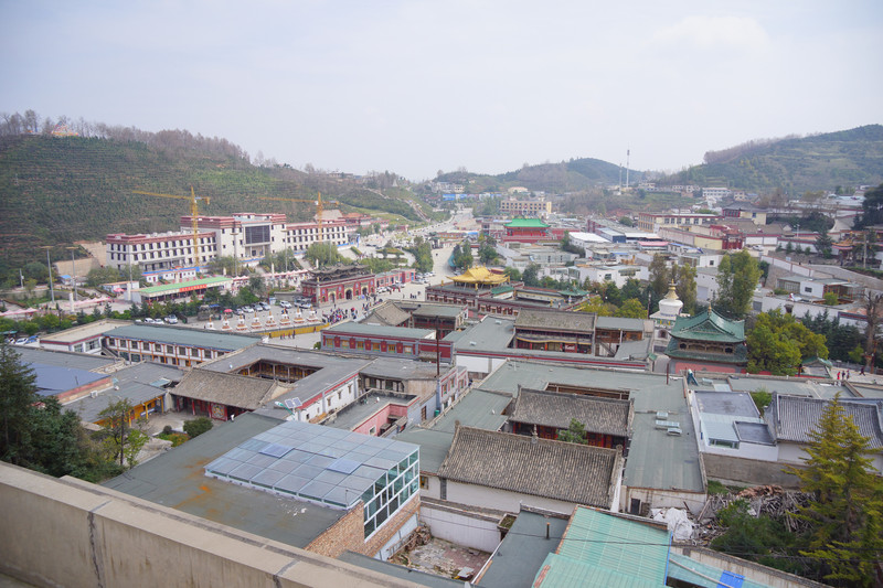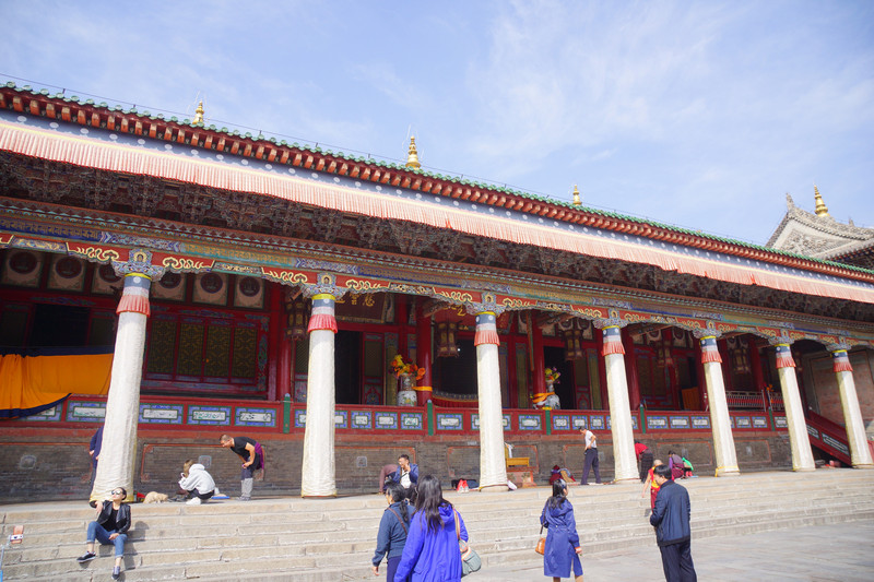 在吉祥行宫处俯瞰整个塔尔寺,寺院依山势建筑,错落有致的屋顶;由众多的殿宇、经堂、佛塔、僧舍组成的一个汉藏艺术相结合的辉煌壮丽的建筑群。怀揣一颗虔诚的心,沐于这座众神共居的天堂,心神合一,超尘脱俗。