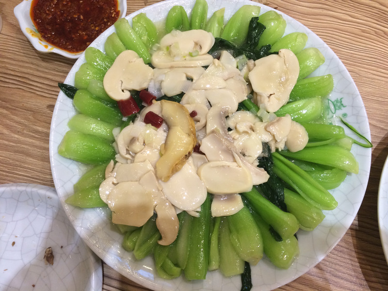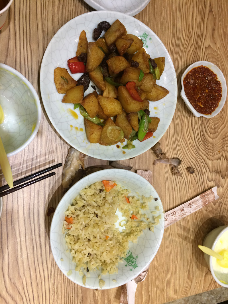来了七两黄焖手抓羊肉,黄焖羊肉上桌时带着一点余温,肉香软烂无膻味,但大家一致认为不如兰州马老六的白切手抓羊肉更好吃(也有可能吃不惯黄焖的味道);自制青海老酸奶,一碗一碗像炖蛋似的酸奶奶香醇厚有点酸,滋味很赞,但肠胃不好的易拉肚子;到大西北怎么着都得吃个土豆的菜,炸土豆,外脆里糯,没辜负我的期望;手抓饭,没吃过新疆的正宗手抓饭,没比较,和南方的炒饭不一样,有嚼劲;蔬菜即便贵点也总得点一个吧,蘑菇青菜,青菜的味正常,但蘑菇的味有点怪,不知是否是罐头蘑菇?
