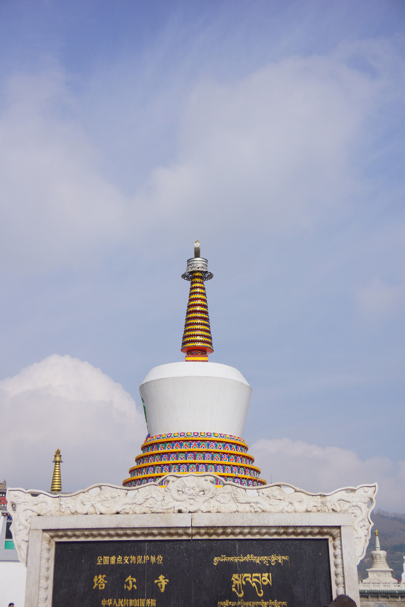 现在我们看到的是时轮大塔,坐落在护法神殿的门前,此塔建于1942年,是为纪念九世班禅来塔尔寺为众僧讲授时轮大灌顶法而建造的。