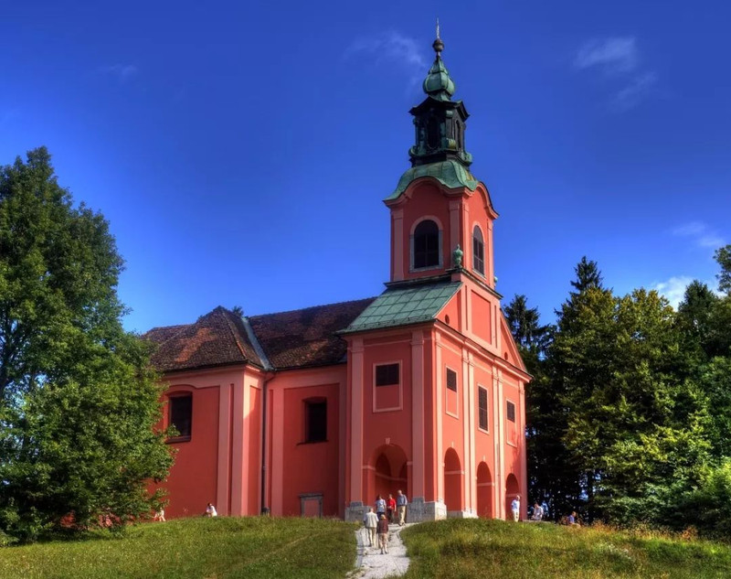 玛利亚显圣教堂坐落在罗兹尼克山顶上,其新古典主义的粉色外墙在阳光下熠熠生辉。尽管历经沧桑,但它总能焕发新生,成为游客们心中的热门景点。附近的花园旅馆和坎卡尔纪念室,更是为游客提供了品味斯洛文尼亚美食与文化的绝佳机会。