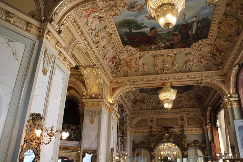 咖啡馆的大厅结合了意大利文艺复兴式和巴洛克式的折中主义风格,富丽堂皇,雕栏画栋。墙面柱体采用柔和雪白的大理石柱,配合大片落地窗和白金浮雕,水晶吊灯恍若宫殿。小提琴和钢琴的演奏声随时在乐池里回荡,使得整个咖啡馆的氛围宁静又优雅。店门外围绕着16个恶魔造型的灯,更是充满了俏皮和趣味。