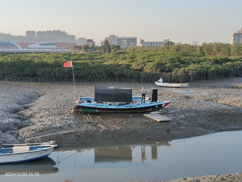 落潮船搁浅在滩涂上,红树林完全露出水面,帅哥在船上引吭高歌。