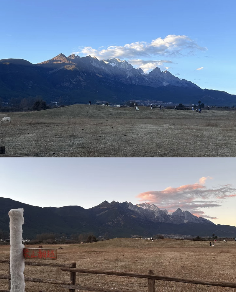晚霞和蓝调时刻都看的到,听说雪山可以治愈一切,雪山下的浪漫,玉龙雪山 ,丽江日照金山!