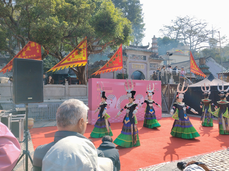 今天妈阁庙广场上热闹的,苗族歌舞还有河北的艺术团在演出。