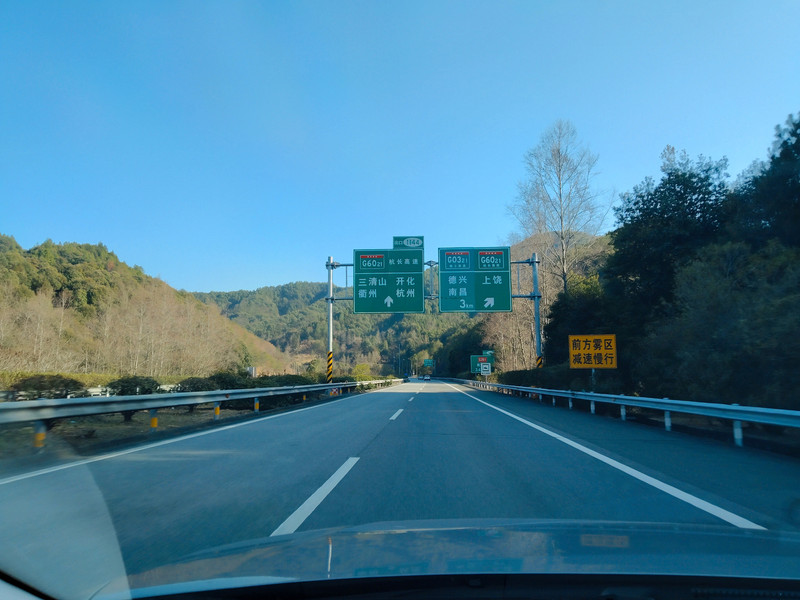 G4012溧宁高速在呈村降枢纽转入G56杭瑞高速,这里前几天可是堵得一塌糊涂啊!不少车子只能下高速去绕行这一段。今天这里也是空荡荡的。想起了上次19年春节陪父母去广深珠港澳。第一天小年夜下午无锡出发,锡宜转沪武,进入安徽走宁芜高速。在马鞍山当涂县住了一晚。第二天除夕一早大雾高速封路,只能走国道。兜兜转转一直到中午才从池州青阳再上的高速。G3京台高速转G56过婺源到达南昌转了一圈,再上G70转入G35。晚上七点多才到达南丰县住宿。这一天很赶,回来后还收到短信在G3黄山段超速10%以上20%以下,虽然只罚了50块钱,但被记了3分。记忆犹新!