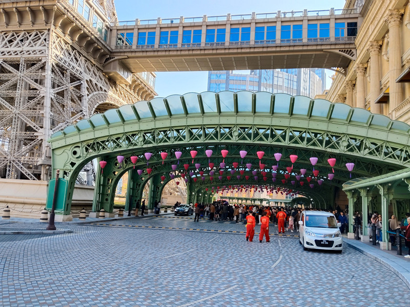 顺着往前走,从巴黎人铁塔下面的绿色顶棚大门进去。这时门口有演出,工作人员在给小朋友发巧克力,大老爷又拿了两块。