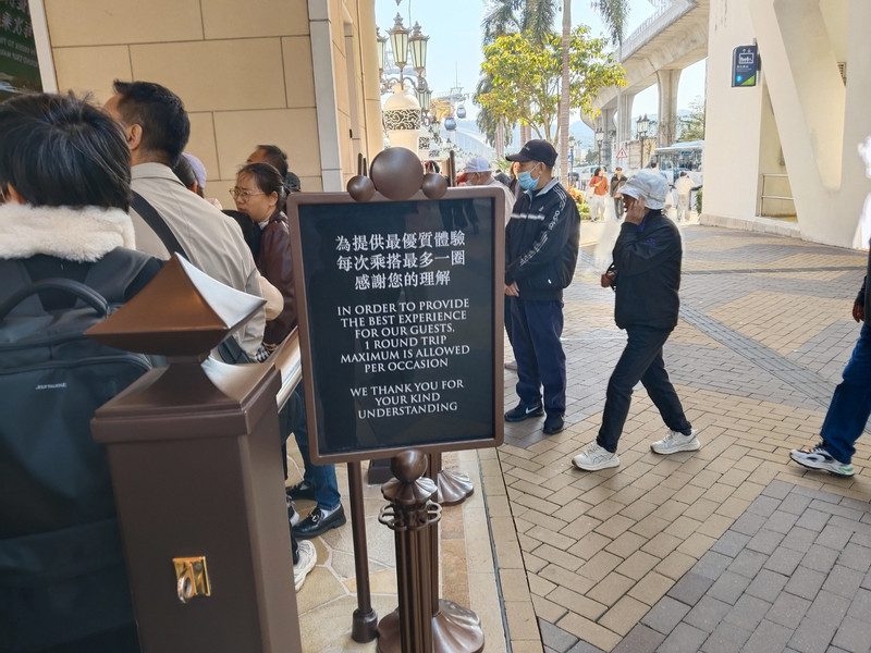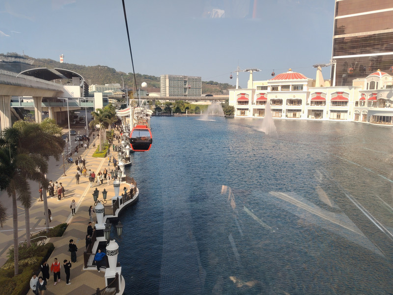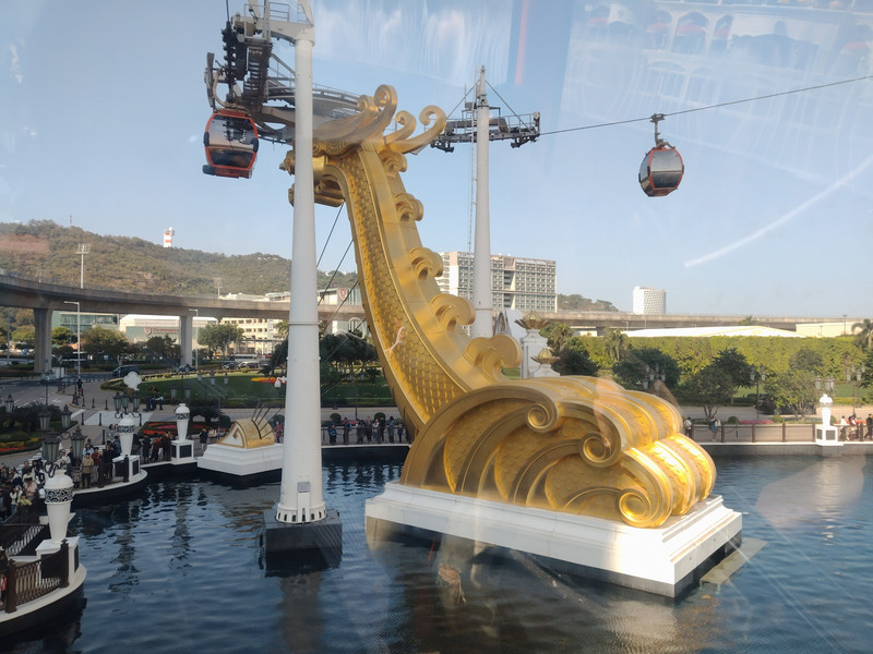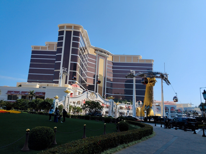 没办法,只能顺着公交站台前的嘉乐庇总督路往前走。还好到永利皇宫也不算太远,而且是下坡路。下坡后坐扶梯上环形天桥,直行过去后第一个往左出口下去。然后走了六七百米,在下一个环岛右转过去,就看见缆车站了。真的很累!关键此时下午太热了,二十多度。