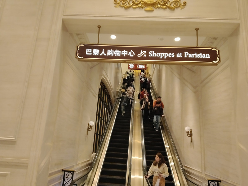 进去看见大堂中间的喷水池 ,马上从右边巴黎人购物中心的扶梯上去。