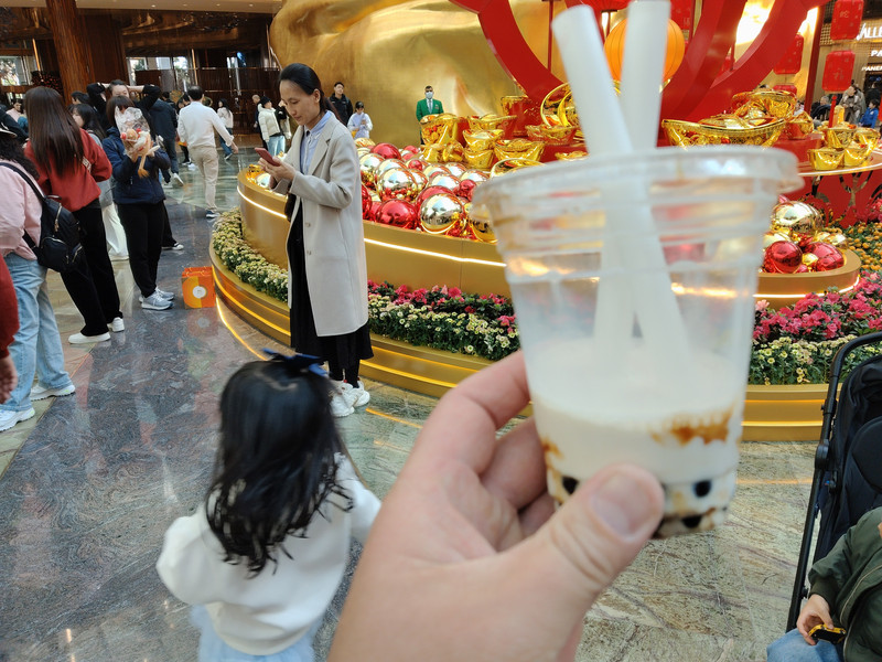 听说美狮美高美的免费奶茶不错,也去拿一杯。还拿了两个小热狗面包。老婆儿子说好喝,里面的珍珠很糯,和内地的不一样。奶茶每人限拿一杯,旁边一位年轻姑娘想拿两杯,服务员说不行。