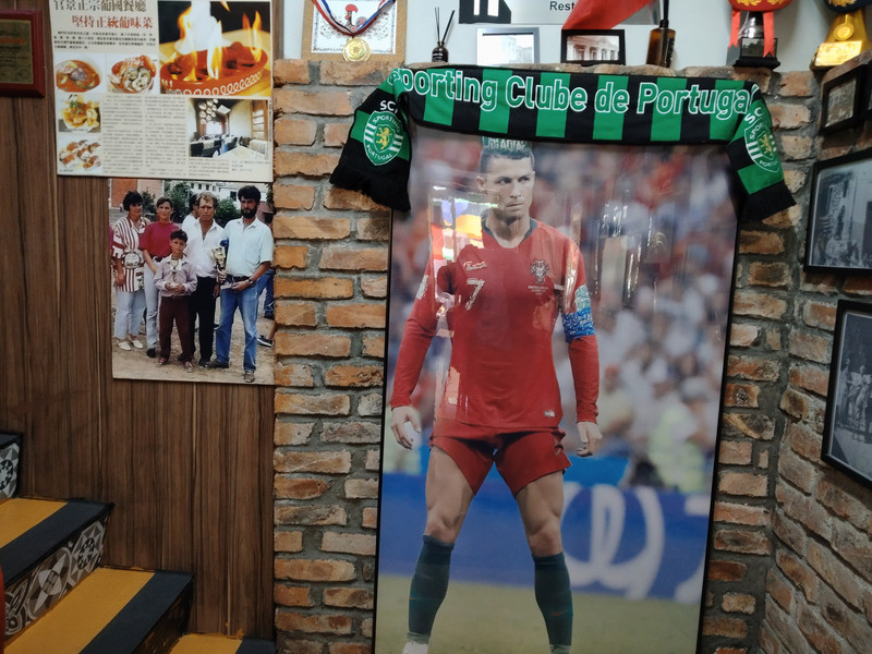 大老远来了就品尝一下平时吃不到的东西。尝尝葡国菜。餐厅不大,就只有几张桌子。老板是C罗,葡萄牙超级联赛劲旅里斯本竞技的忠实球迷。餐厅里的工作人员都是土生土长的澳门葡萄牙人,他们的祖先很早就来到了澳门。外观上还是和华人略有区别的。只有一位大姐服务员会说国语。其他人一会说葡语,一会说粤语。