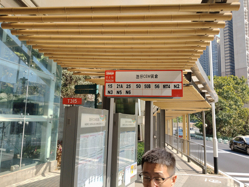 买完饮料往前走。光复街上坡走到头,再过天桥就是氹仔CEM货仓公交站。天桥过去就是电梯,往下台阶是公交车站台。