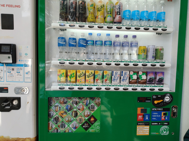 嘉模泳池门口的自动售货机上买了两盒软包装的饮料。操作很简单,对着想买的饮料下方摁扭,然后打开微信付款码,要对着机器扫个十几秒。付款成功后饮料就会掉下来。微信自动结算,两盒饮料各5澳门元,各付款四块多人民币。