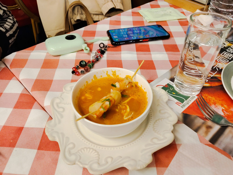 点了海鲜汤。礼拜鸡被告知要半小时,因为是现做的。来都来了,也不差这半小时了。先上了烤面包,蔬菜色拉,这些都是送的。