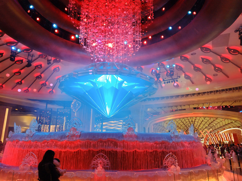 从西门进去的,钻石大堂在东门。到了钻石大堂,就有美女给小朋友发巧克力。看看价值18.5亿的钻石。钻石秀每天上午10点到晚上10点,每30分钟一次。