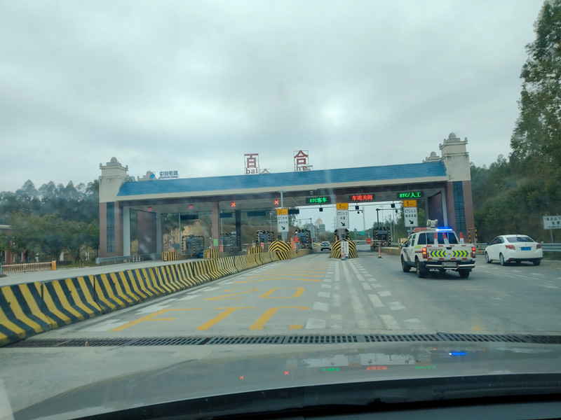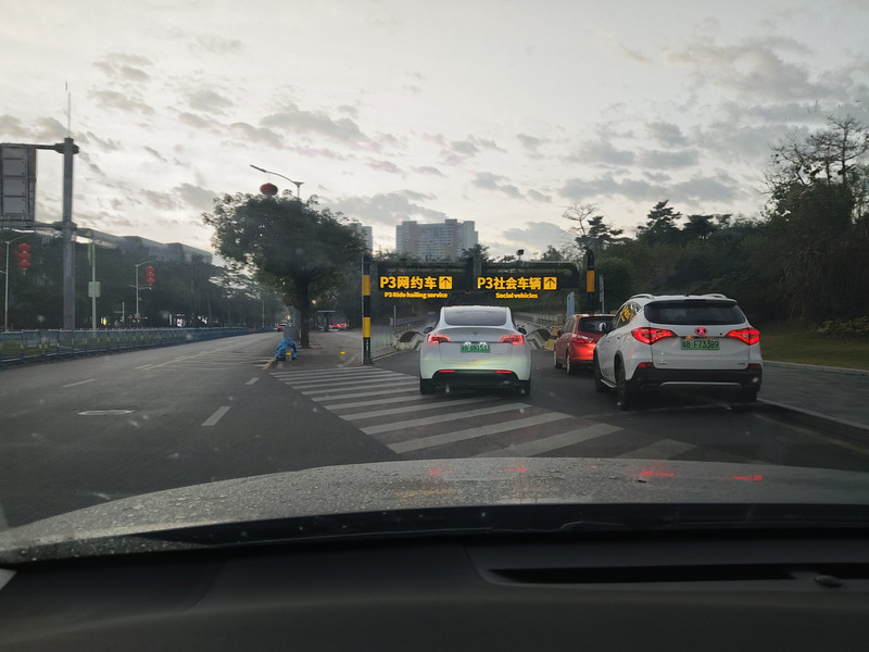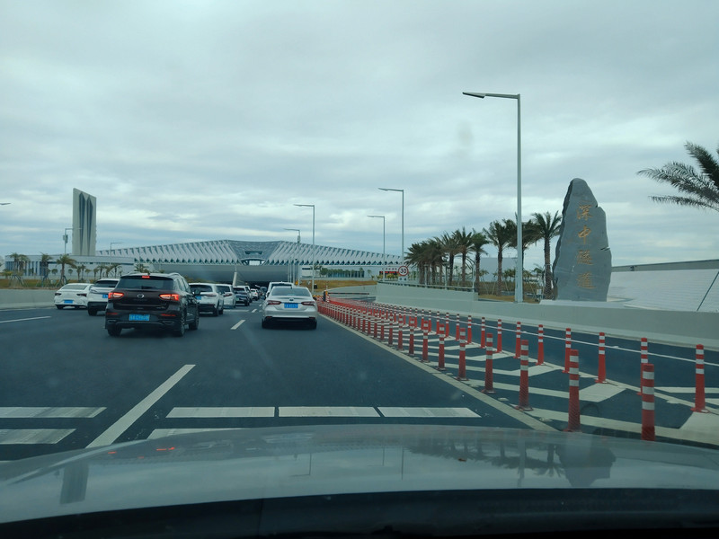 又是和前天来的时候一样。到了东面深圳地界的隧道入口,开始缓行了。隧道上面是人工岛,不对社会车辆开放。匝道口被封闭了。
