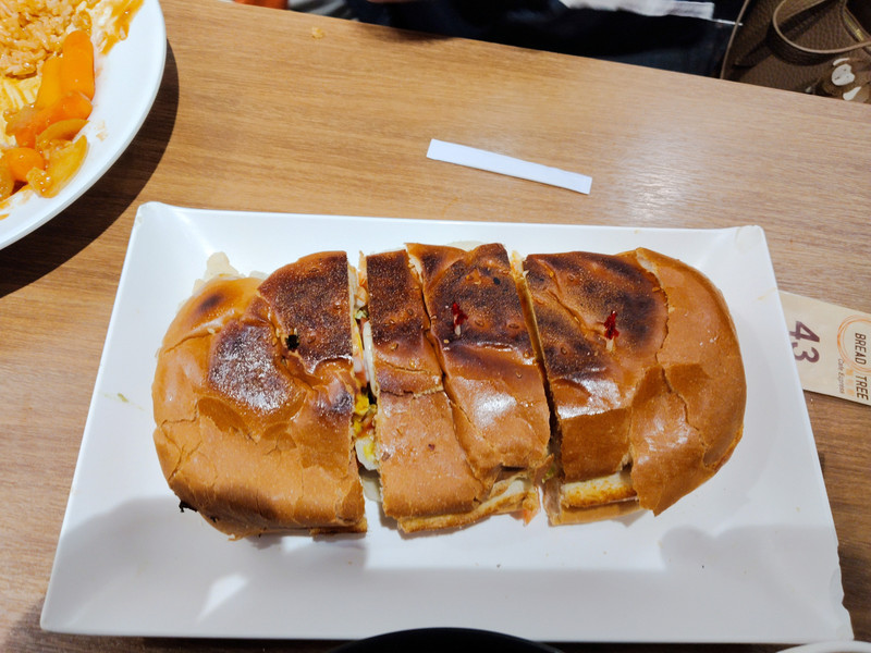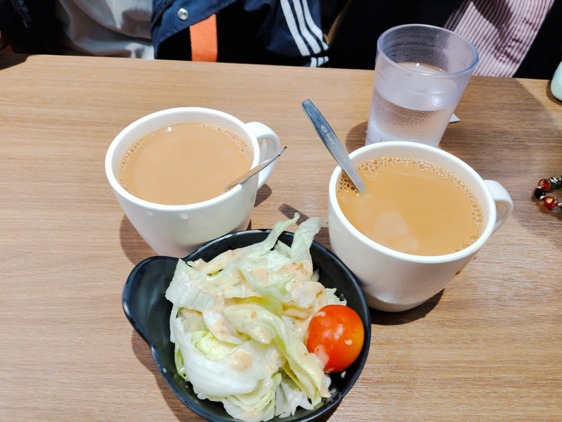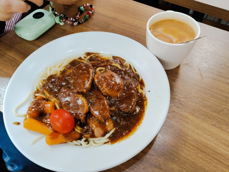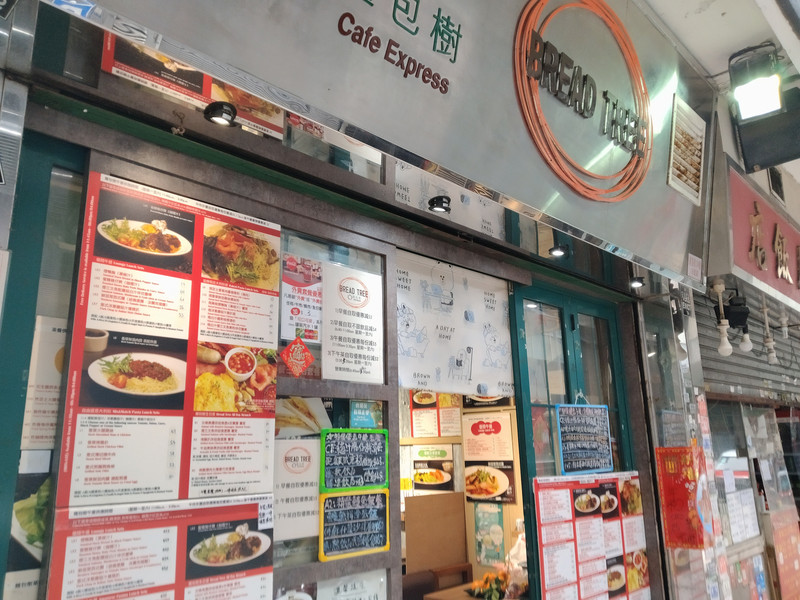 上次吃的茶餐厅好像没了,就在旁边的茶餐厅吃。老板是位六七十岁的老阿姨。全店里只有她会说国语,只能到她站的收银台那里点餐。老阿姨很热情,普通话说得也凑合,最起码能听懂。还推荐了大老爷吃的意面里加黑椒汁。