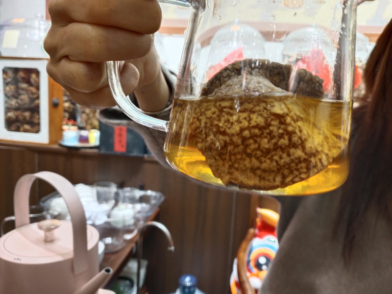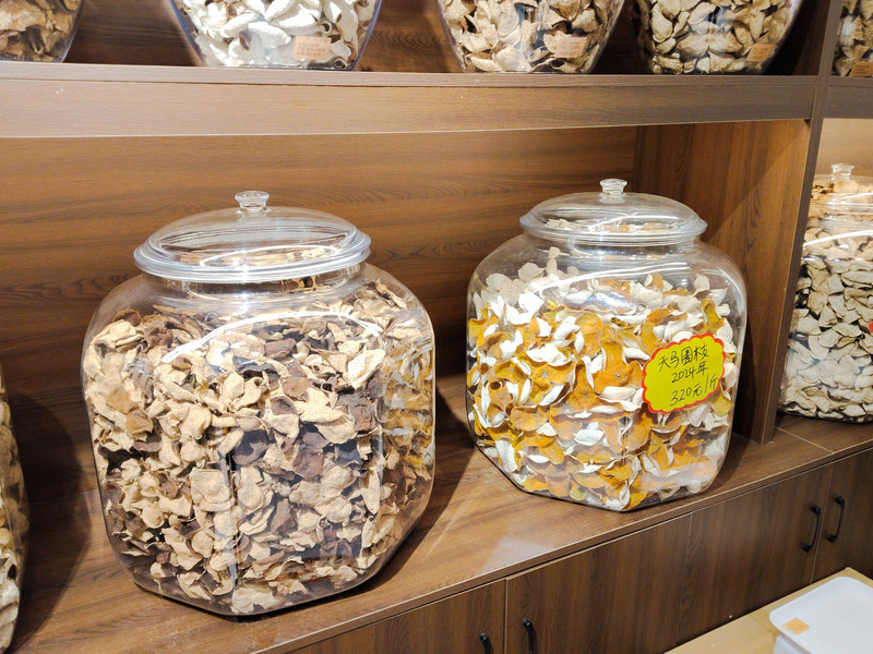 转了一圈。一位美女热情地邀请我们去她店里品尝陈皮茶。现场泡了给我们喝。还介绍了如何泡制陈皮茶。美女的粤语普通话,说的还算是很标准。她说市场外面的假冒陈皮太多了,不少都是广西的柑橘皮。你们只有到实地来了,才能真正了解新会陈皮。辨别真伪。她店里的陈皮都是自己家里种的,再自己晾晒,加工的。