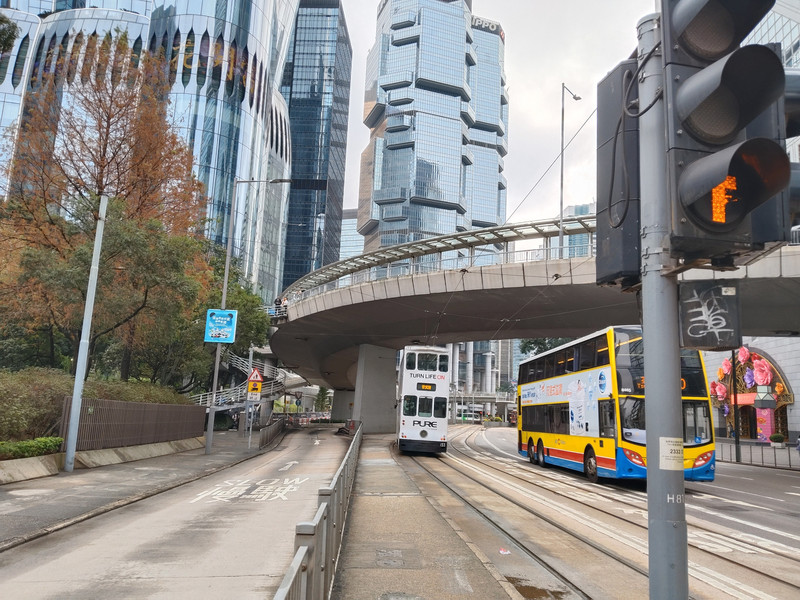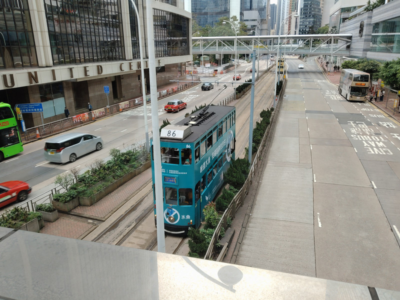 过马路时。正好香港有轨电车,又称铛铛车过来了。