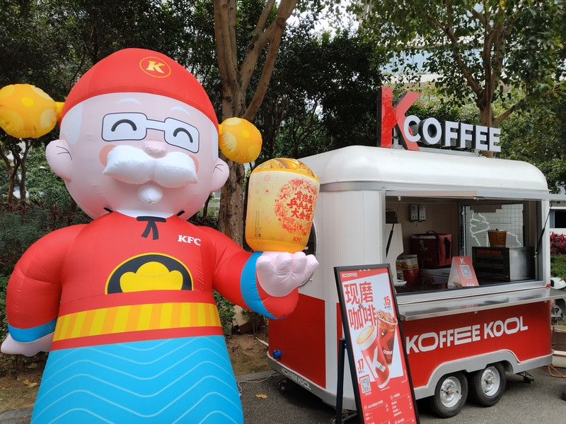 公园里有肯德基的餐车,财神爷装扮的肯德基老爷爷。