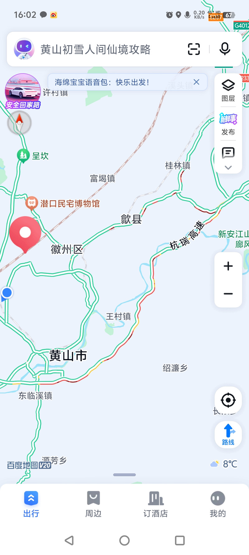 对此早有对策,这一段是本次行程最大的堵点。过了这里,今天基本OK了。再次启动备选方案:G3继续往北合肥方向。屯溪西下高速后,开始我看手机地图,老婆开车。此时这里一片堵得一塌糊涂,路况很复杂。我指挥老婆出收费站马上左转齐云大道,再左转梅林大道,过黄山北站。进入歙黟公路。