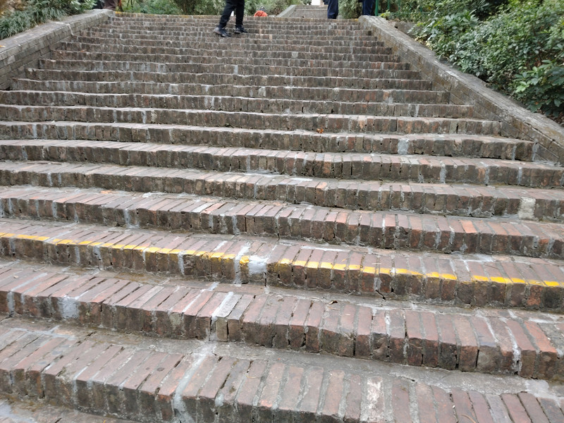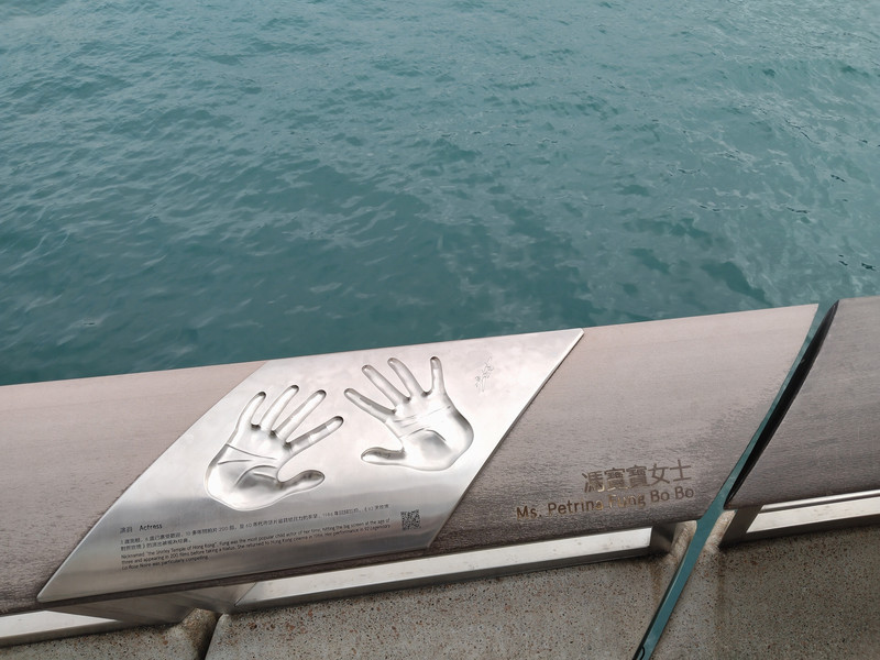 和上次走一样的路线。星光大道往东走到头,看见这个过街天桥。坐扶梯上去往前走,穿过一个平台上的讯号山花园,再下台阶。就是尖东地铁站了。