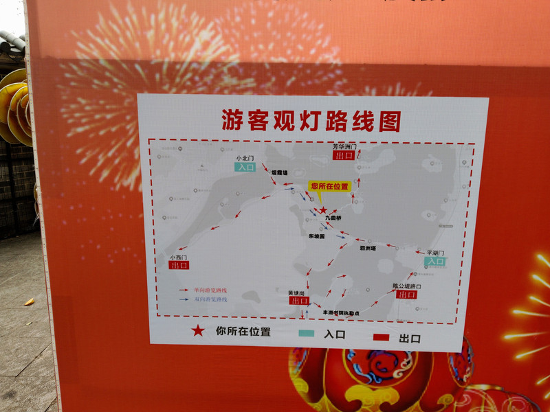 春节期间晚上灯会是单向游览的。晚上六点开始到十点半,只能从正门东门进,西门北门出。