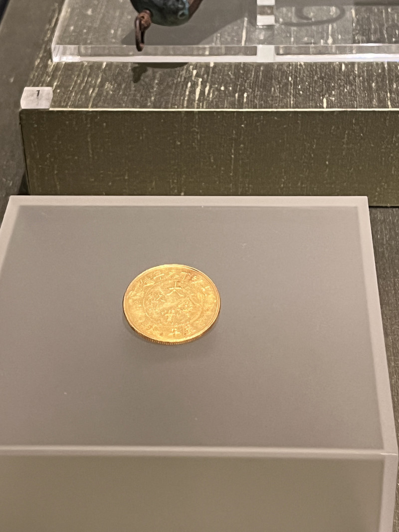 ▫️ 继续往前走,我们会看到难得一见的大清国光绪年间从未正式发行的金币。这个金币上面写着“库平一两”,现在的价格,每枚价值约300万人民币左右。