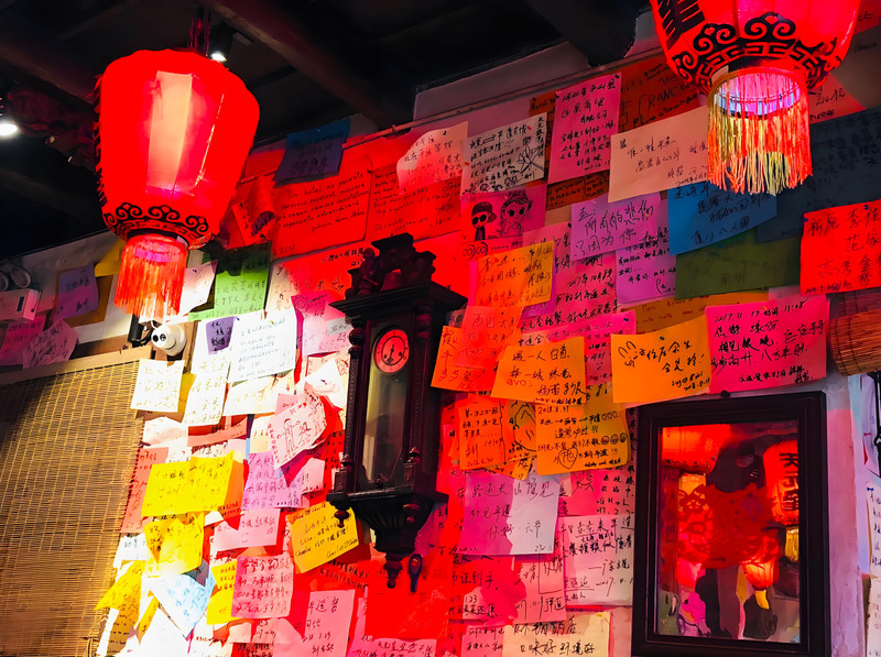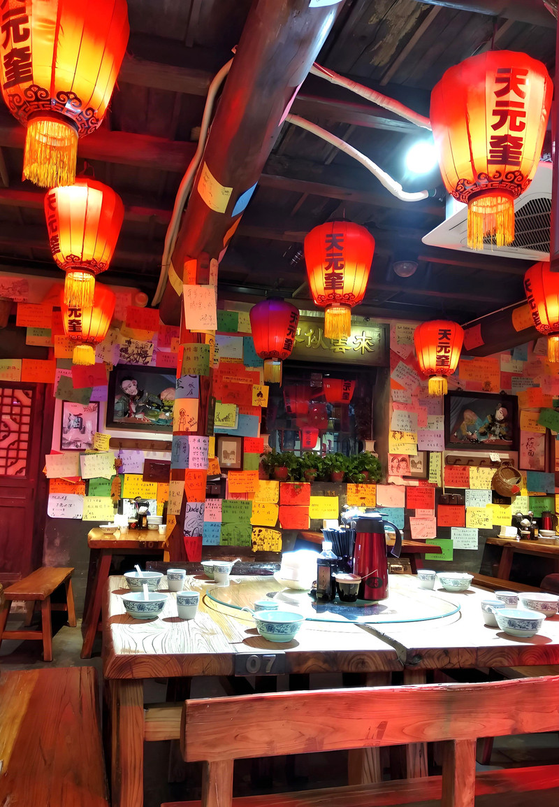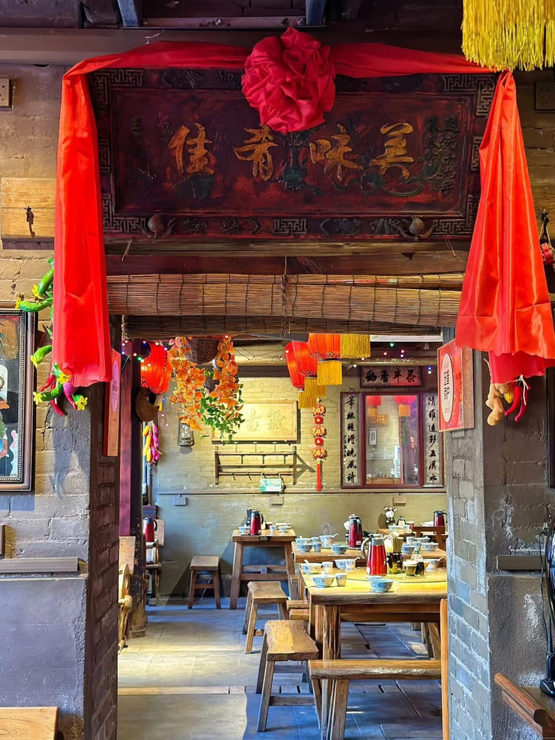 环顾四周发觉,高挂的灯笼、条旗等,营造出了古色古香的氛围;再加上古朴的门脸,考究醒目的牌匾,精美的房檐瓦当,古韵的气息瞬时萦绕全身。我触摸着全木质结构的四方木桌、长凳,感觉穿越回到了大清繁华的年代。
