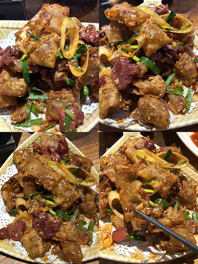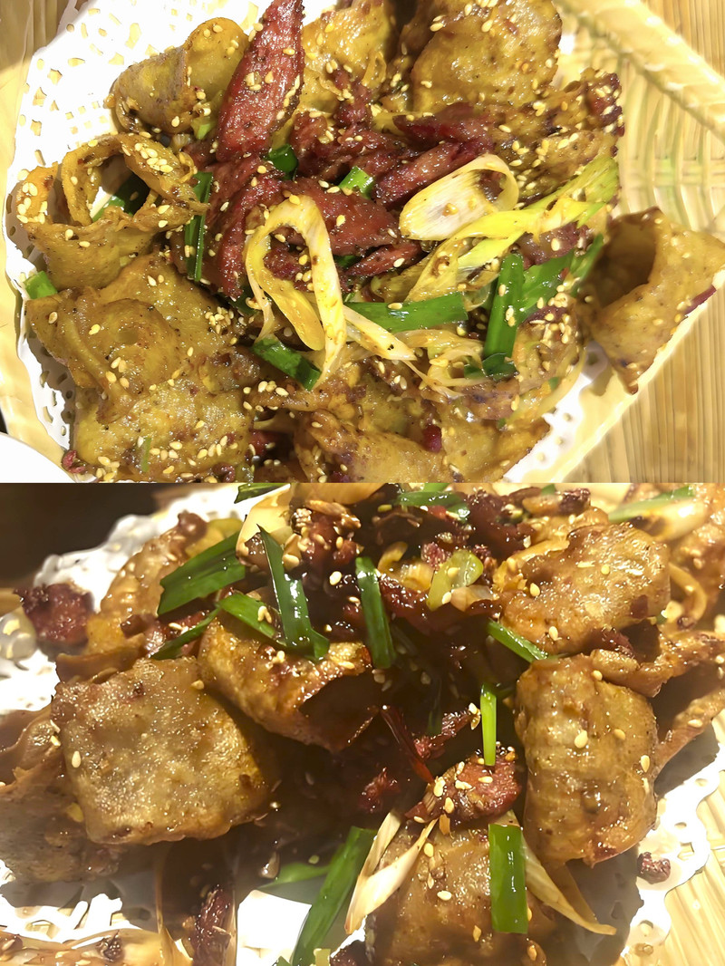 干煸牛肉栲栳栳:莜面栲栳栳是古城的招牌美食,而天元奎的干煸做法也堪称一绝!金黄酥脆的栲栳栳,形如蜂窝,蓬松诱人,散发着诱人的麦香。天元奎精选上等牛肉片,经过慢火干煸至外焦里嫩,再搭配老陈醋腌制的黄瓜丁、鲜香的青蒜碎。