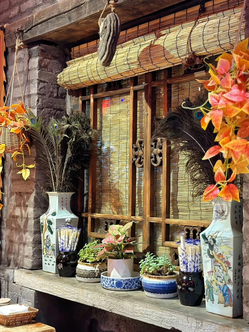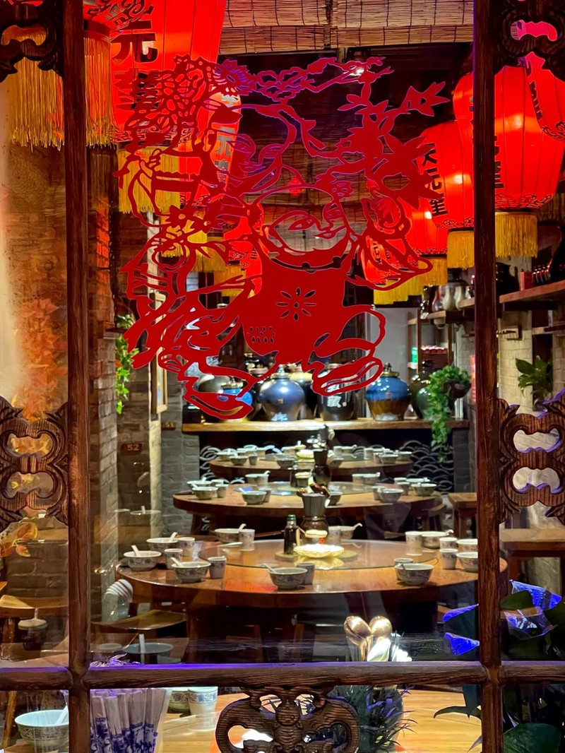 跑堂服务员秉承笑语盈盈,热情的招呼食客落座点餐。我选定了靠近镂空木质窗户的卡座,对外能看到熙攘人潮,对内能欣赏店里光景。仰头望去,梁柱间的木雕雀替上,葡萄藤蔓缠绕着"日进斗金"的吉祥纹样,耳边有种驼铃声萦绕的错觉。
