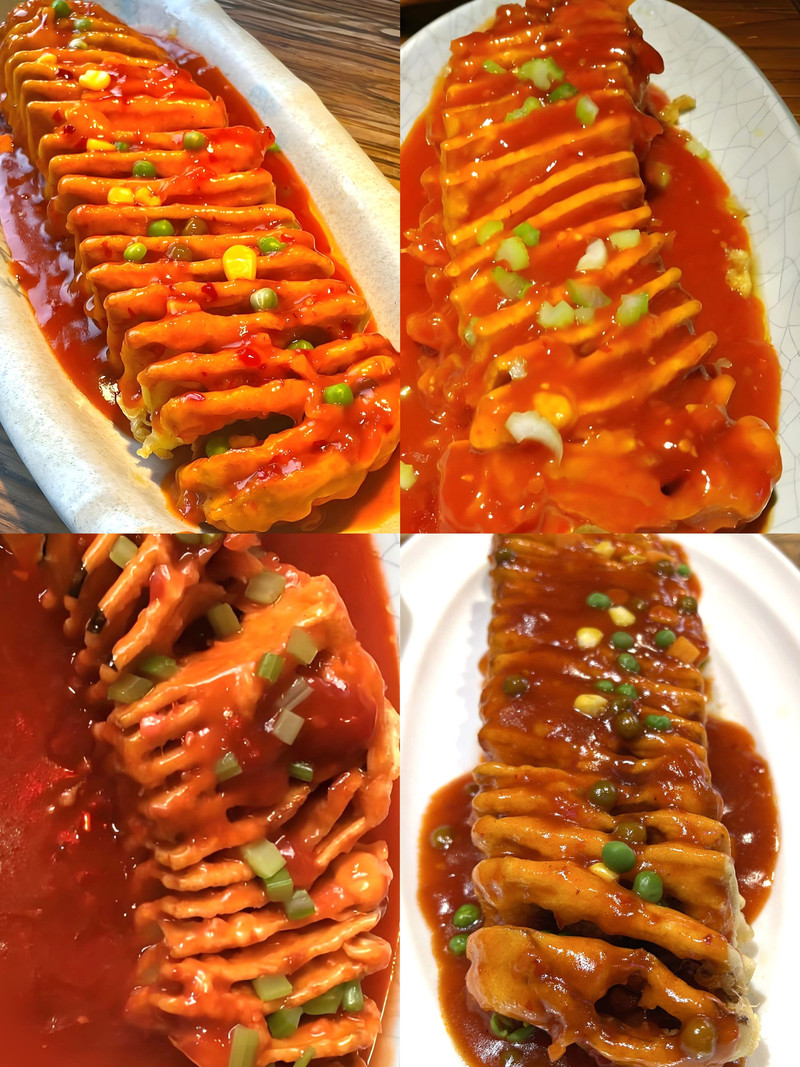 长龙茄子:造型非常的别致,很像松鼠鳜鱼。长长的茄子条炸得金黄酥脆,外皮轻轻一咬就咔嚓作响;而里面却是嫩滑的茄子肉,口感层次丰富得很,吃起来十分的过瘾!