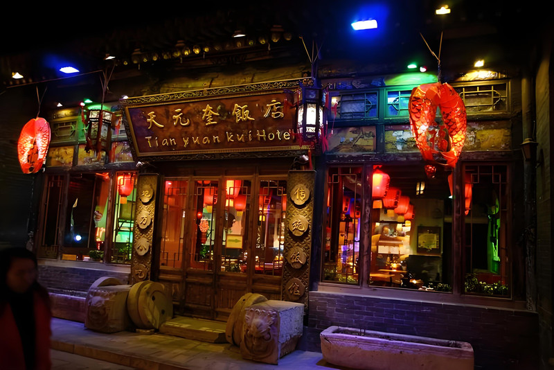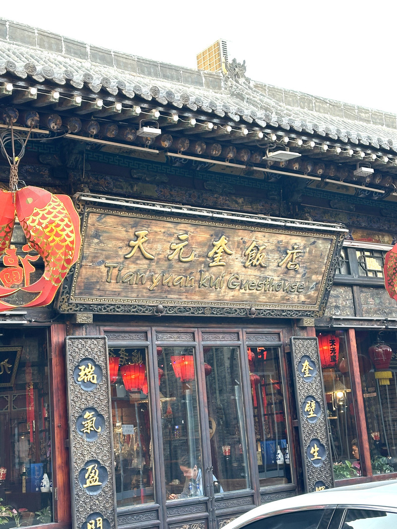说实话,天元奎饭店的位置真是得天独厚,与平遥古城地标是的市楼相隔不远。只见一串红灯笼,在黛色屋檐下轻轻摇晃。灯笼之下,"天元奎"三个鎏金大字赫然入目。
