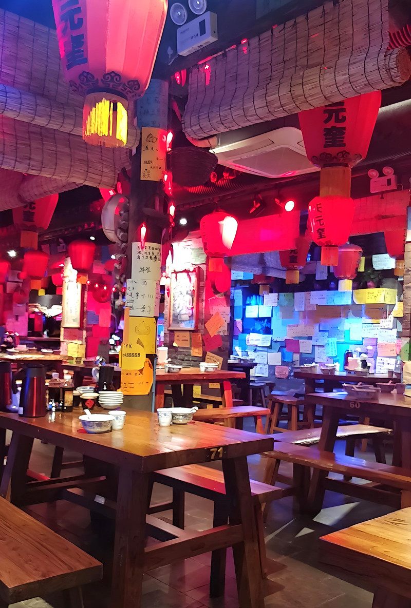 临窗卡座正对巍峨的市楼,暮色中咬一口"市楼"冰棍;榫卯结构的冰雕,在舌尖融化出淡淡的黄酒香。楼下传来打更人的梆子声,红汤铜锅羊杂在桌上咕嘟冒泡,羊肚脆、羊肝糯、粉条滑,辣味顺着喉咙,渐渐的变成了一道暖流。