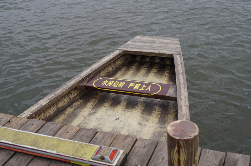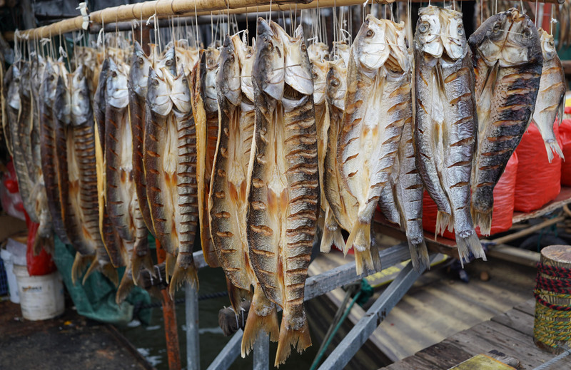 踏上浮桥,西桥头渔船上晾晒着鱼干
