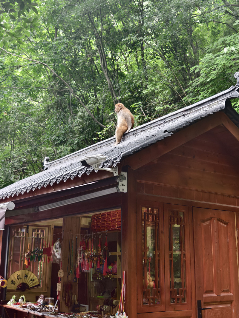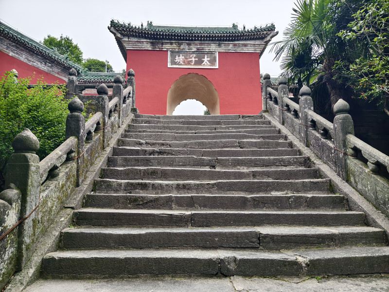 继续坐车到太子坡,到太子坡又开始下雨了,从停车场走到太子坡入口,还有一段距离,这段路上会有猴子出没。太子坡又叫“复真观”,是武当山建筑群中规模最大、最完整的道观。