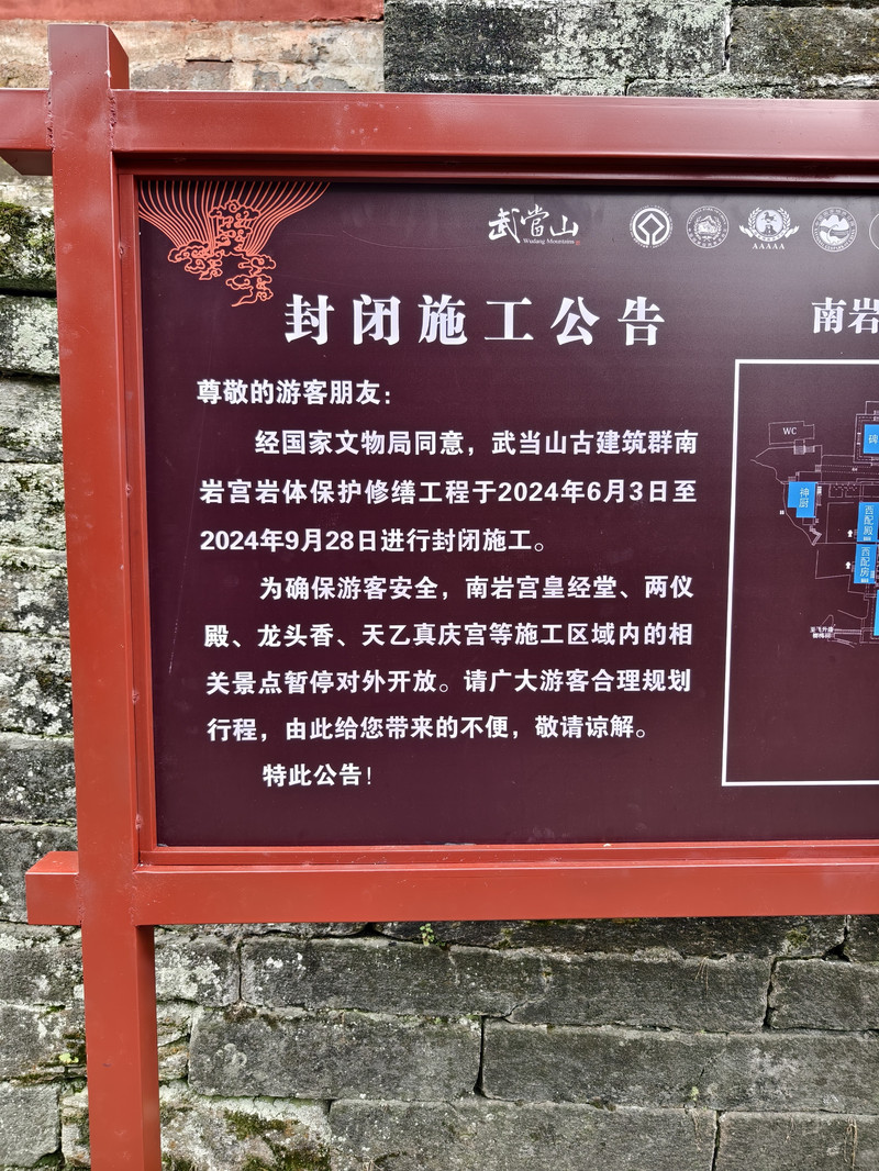 走到南岩宫龙虎殿前,看到封闭施工公告,包括龙头香在内的相关景点关闭,只能走到玄帝殿。最想看到的龙头香看不到了。