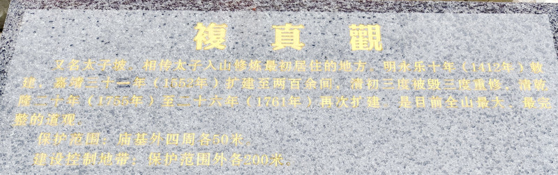 复真观大殿(祖师殿)敕建于明永乐十年,嘉靖年间扩建,明末毁坏严重,清康熙二十五年重修。大殿内供奉真武神像和侍从金童玉女。更值得一说的是,这一组巨大的塑像为武当山全山最大的彩绘木雕像,历600年,仍灿美如新。
