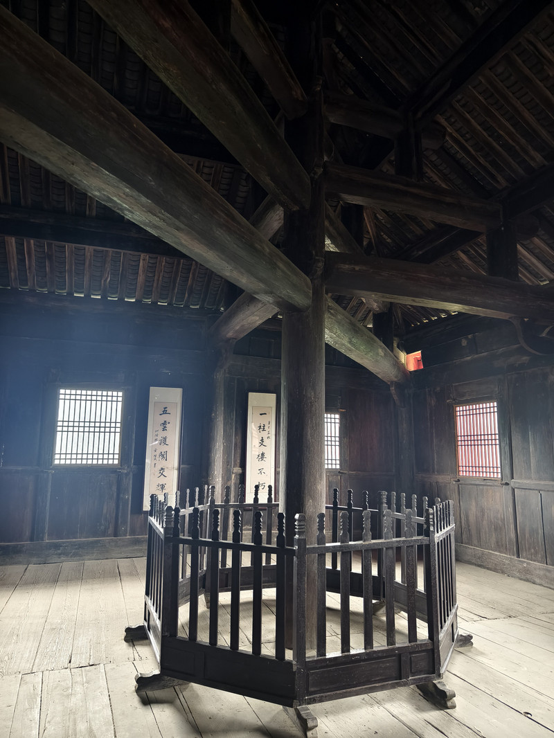 五云楼也叫五层楼,高15.8米,是现存武当山最高的木构建筑。 在不开挖山体的情况下,完全依山势变化而建。五云楼最有名之处就是它最顶层的“一柱十二梁”,也就是说,在一根主体立柱上,有十二根梁枋穿凿在上,交叉叠搁,计算周密。