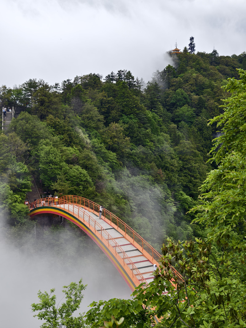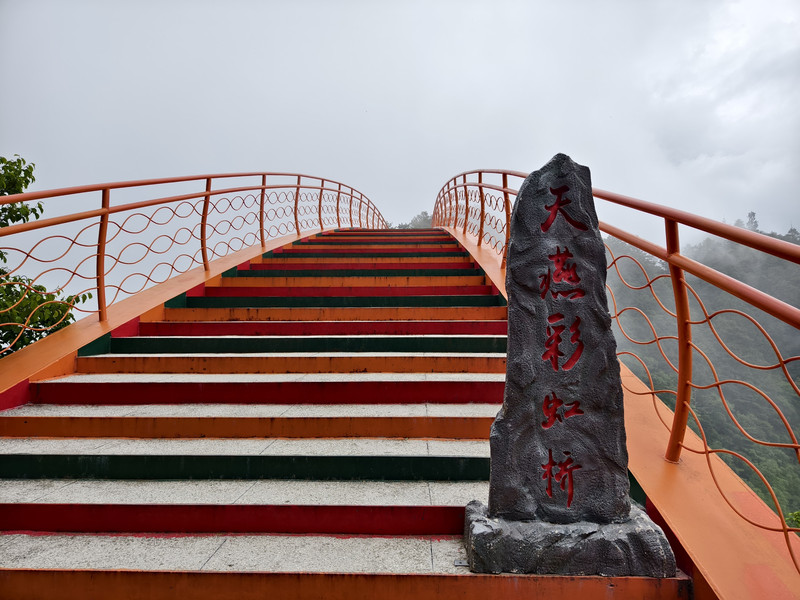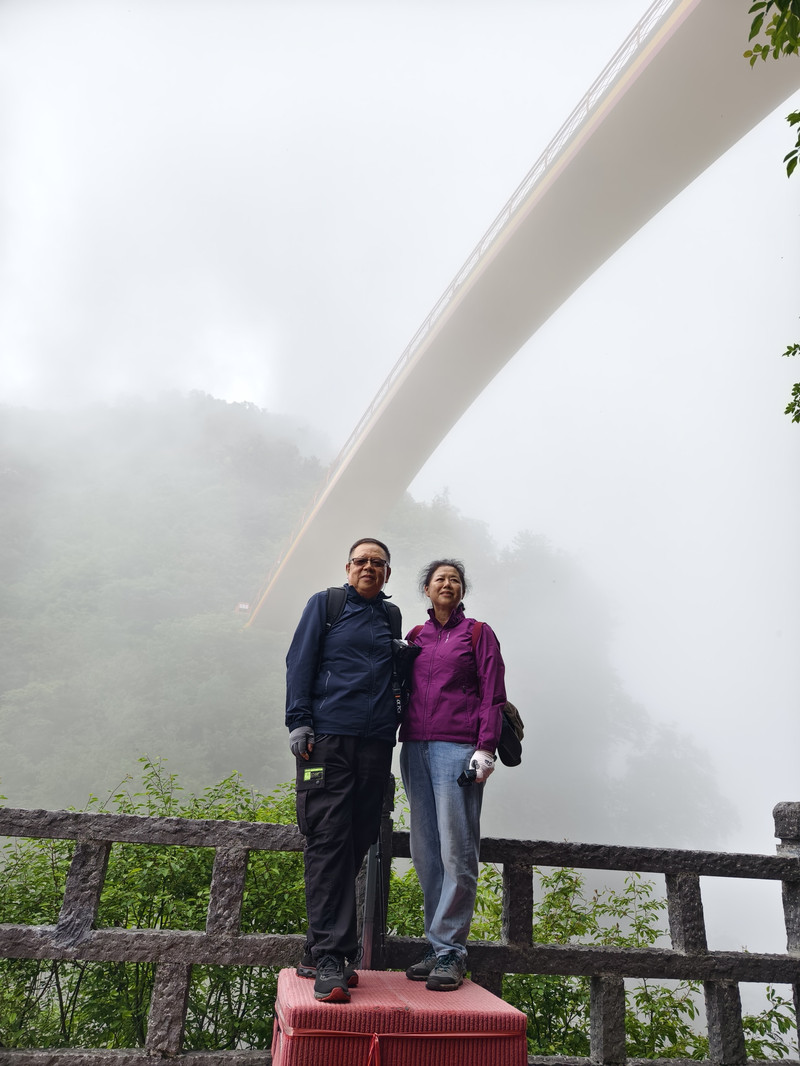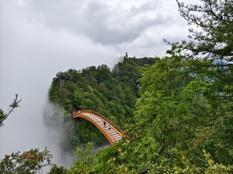 到这里,明显感觉气温低了,穿一件衣服有点凉。要想到网红桥上走一走,先爬山,经过燕子洞 ,再走不远就是。站在网红桥观景平台,被眼前景色所震撼。以彩虹桥为界,一边云雾缭绕,什么都看不清,一边郁郁葱葱,是一望无际的原始森林。云雾从彩虹桥上飘过,宛若仙境,令人痴迷,实在是太美了。仙境转瞬即逝,一会的工夫,就消失在云雾中。我们的运气还不错,再晚一些彩虹桥就看不清楚了。