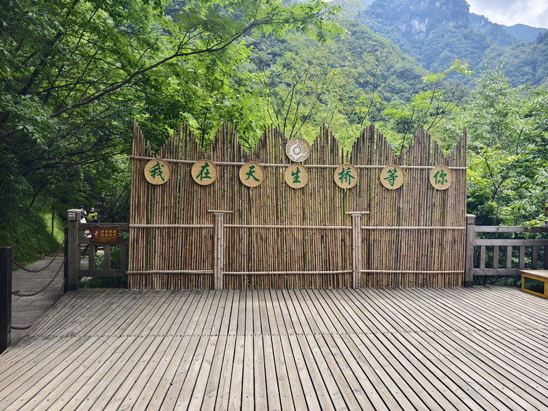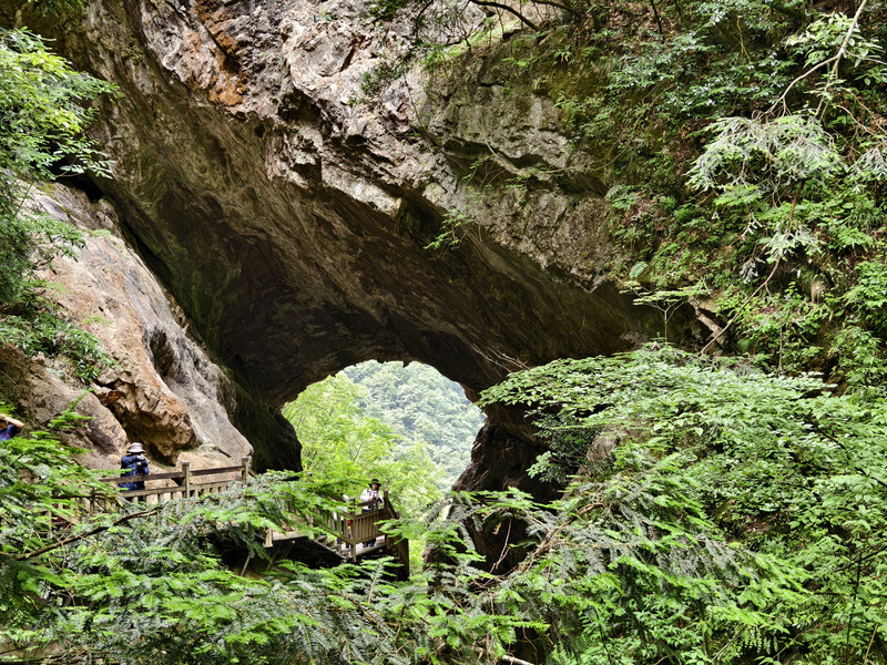 6月10日,出行的第十六天。这天计划游览木鱼镇附近的神农坛、观门山、天生桥三个景区。先去最远的天生桥景区。出木鱼镇不远,路边有一条瀑布,这是这次出游看到的第一个瀑布,还挺兴奋的,这里是小当阳观景平台。继续走就到了天生桥景区,我们上午9点半到达,已经有很多游客了。
