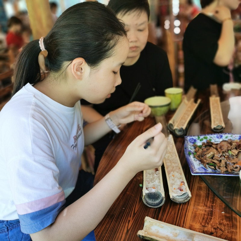 午餐,旅行团只赠送竹筒饭,由于导游没有提前告知,自己没有准备干粮,就在饭店点了两个菜,价格略高。导游会在路上推荐竹筒鸡,半只88元。尝鲜的可以试试。