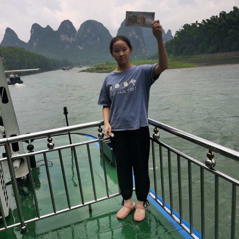 在兴坪游船码头坐船,去看20元人民币上的拍摄点,途中还有很多当地的人划着小船带着鸬鹚来让大家合影。