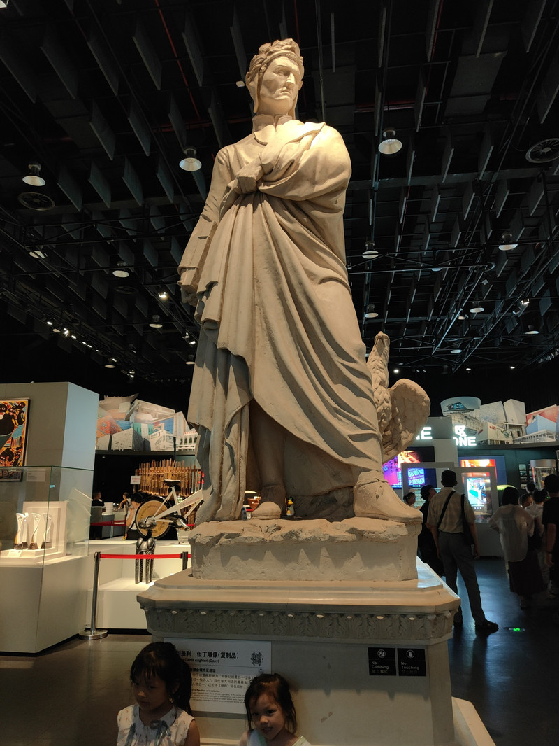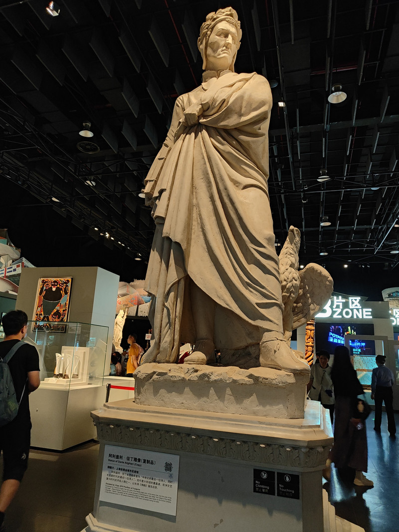 在展厅的入口处,一尊阿利盖利·但丁的雕像复制品静静矗立,由上海世博会城市足迹馆捐赠。但丁作为现代意大利语的奠基者和欧洲文艺复兴时代的开拓人物,其雕像不仅是对这位伟大诗人的致敬,也寓意着世博会对于文化交流与传承的重视。