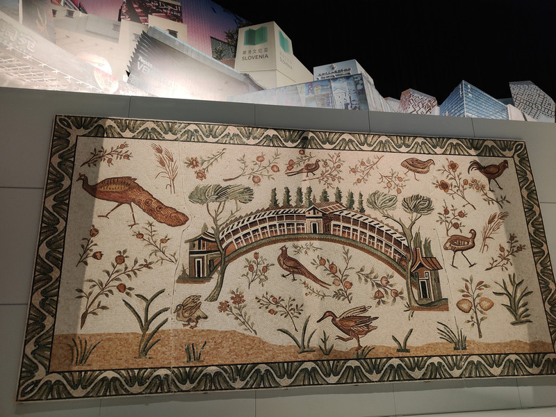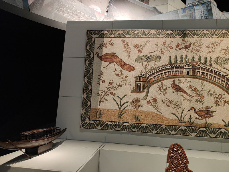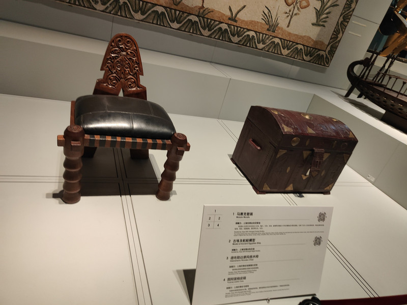 马赛克壁画我初看还以为是一块绒毯,主要是跟咱们中国的壁画风格迥异,画面有宫殿长廊、四周点缀孔雀花草等,整体设色比较素雅,不像油画那样色彩浓烈。古埃及航船模型是一艘木船,比起咱们郑和下西洋那会儿用的宝船,其规模和精致程度那是差得太远了。德布勘达摩风格的木椅和一旁的皮箱,很有文艺复兴时候的风格。尤其是那张木椅,四只椅腿很粗壮,样子有点像柱子,椅背又窄又短,还镌刻着花纹,这种椅子坐起来想必并不会太舒服。