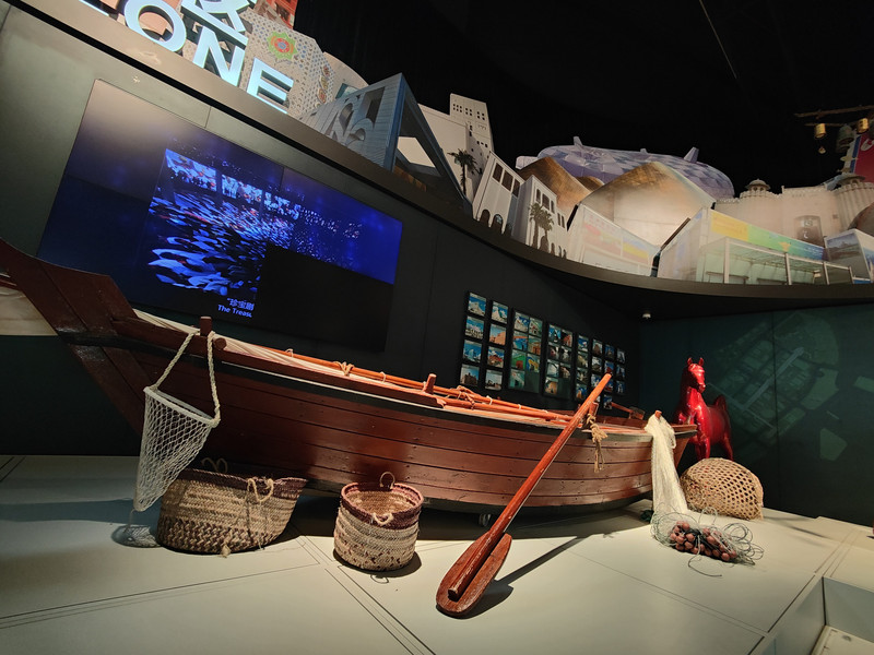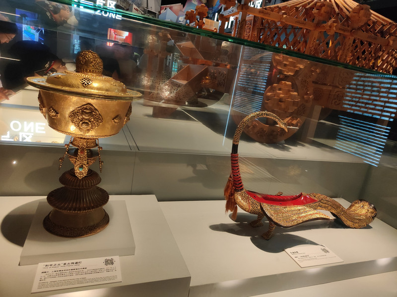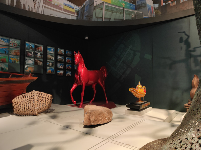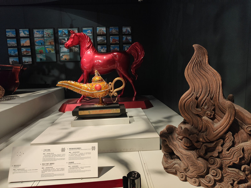 卡塔尔馆的渔船可比古埃及的航船模型大多了,完全可以载人,这可能是等比例的一艘小型渔船,船上还挂着渔网,船尾有一只鱼篓。阿联酋馆的特色雕塑马由红、绿、白、黑四色组成,这也是阿联酋国旗的颜色。东帝汶馆的赠品是海百合化石,这也太符合岛国的定位了。伊拉克馆捐赠的是阿拉丁神灯,因为《一千零一夜》的广泛流转,阿拉丁神灯那可真是太出名了,这件神灯通体金黄,镶嵌各类宝石,尤其是一颗红宝石非常闪。灯的造型也很奇特,感觉有点像海螺,灯柄的造型线条很奇特,还镶嵌着碎钻。这好像跟我概念里的阿拉丁神灯不大一样,大概是受图片插画的影响。越南馆捐赠的是龙吻雕塑,龙是越南的民族图腾,估计也是从中国流传过去的,越南在很长的一段时间里,都是我们的属国。