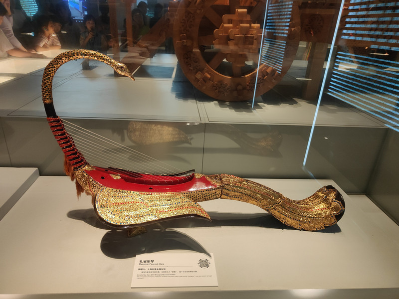 缅甸馆的孔雀乐琴也是相当的华美,整体镀金色,尾羽部分很长,微微开展,雀身上则置放琴弦,既是一件乐器,又是一件艺术品。