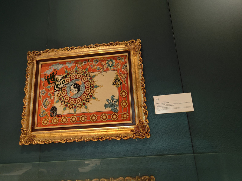 伊朗的挂毯很华丽,色彩鲜艳浓丽。波斯地毯久负盛名,是伊朗文化的代表,居然还结合了中国传统的八卦图,右下角则是上海世博会的吉祥物海宝,伊朗的这件赠品,可以说是诚意满满。